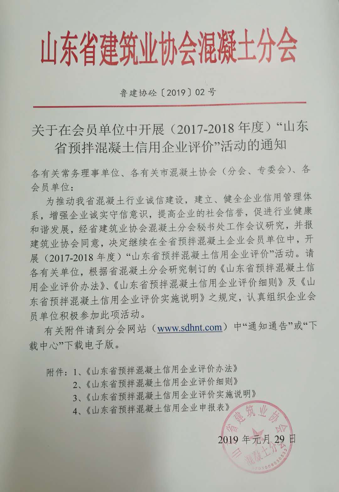 关于在会员单位中开展(2017-2018年度)“山东省预拌混凝土信用企业评价”的通知