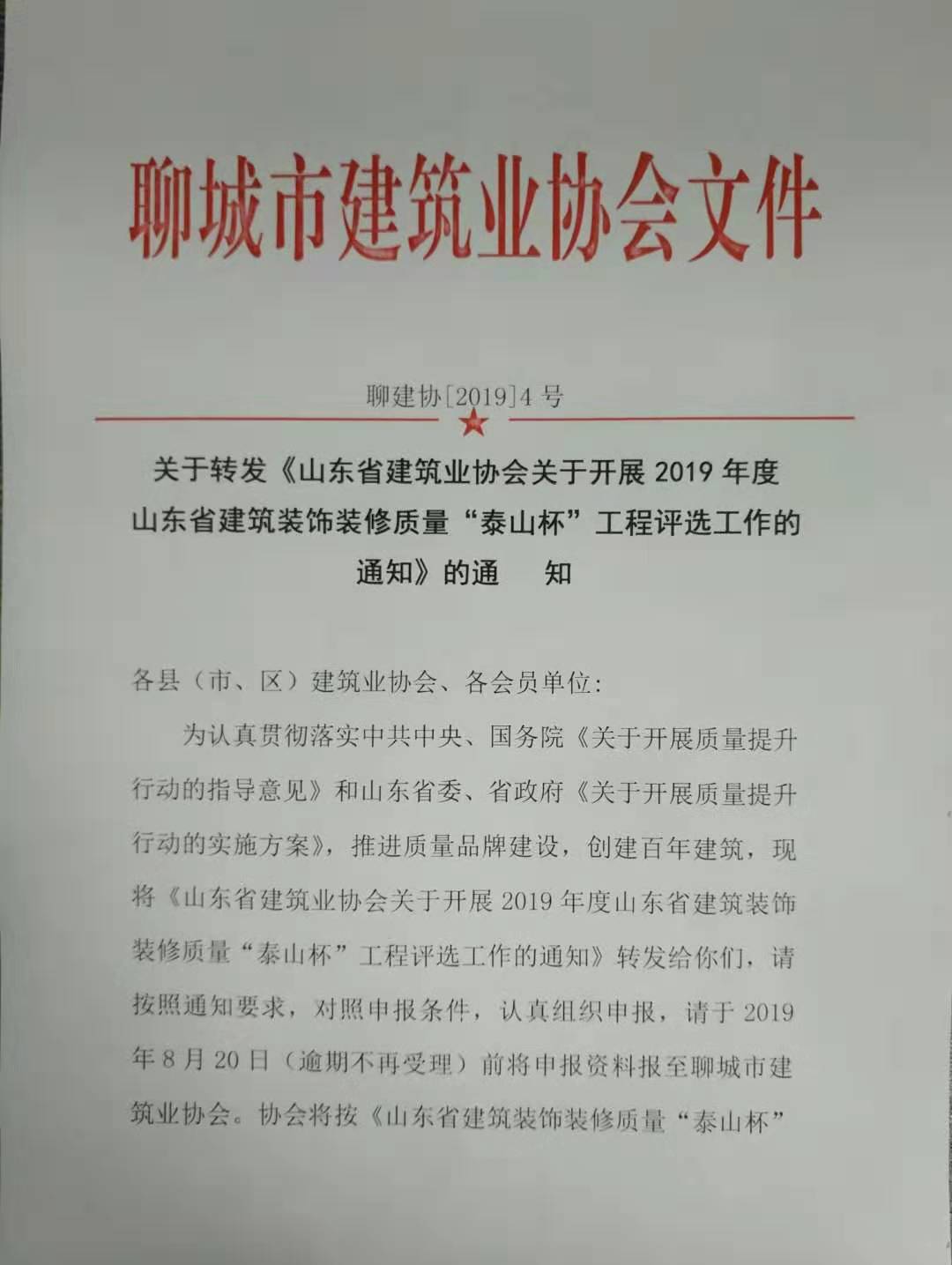 关于转发《山东省建筑业协会关于开展2019年度山东省建筑装饰装修 质量“泰山杯”工程评选工作的通知》的通知