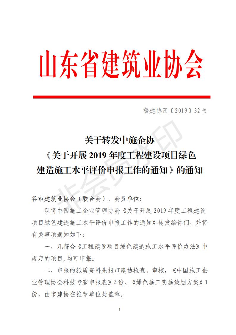 1、中施企协《关于开展2019年度工程建设项目绿色建造施工水平评价申报工作的通知》.docx