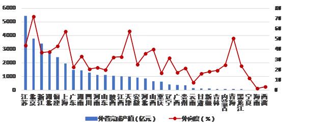 图4 2019年上半年各地区跨省完成的建筑业总产值及外向度