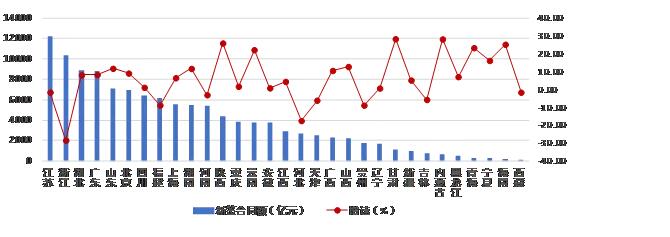 2019 年上半年,江苏、浙江两省建筑业企业新签合同额继续占据前两位,分别达到 12211.27亿元和 10358.55亿元。新签合同额超过 5000 亿元的还有湖北、广东、山东、北京、四川、福建、上海、湖南和河南 9 个地区(图 3)。新签合同额同比增长较快的地区是甘肃、内蒙古、陕西、海南、青海和云南,增幅均超过了 20%。9个地区新签合同额出现负增长,其中浙江负增长******,为28.4%。