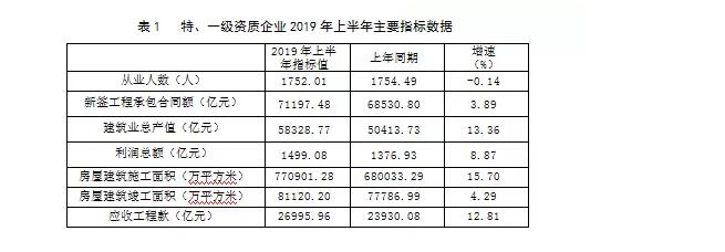 住房和城乡建设部汇总的6552个特、一级资质建筑业企业2019年上半年主要指标数据如下(表1)。
