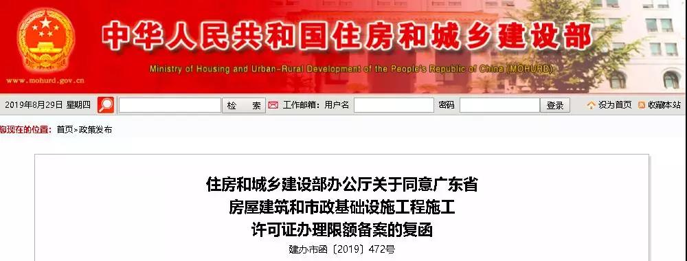 2019年8月16日,住房和城乡建设部办公厅复函广东省住建厅,同意其《关于申请广东省房屋建筑和市政基础设施工程施工许可证办理限额备案的请示》,并予以备案。