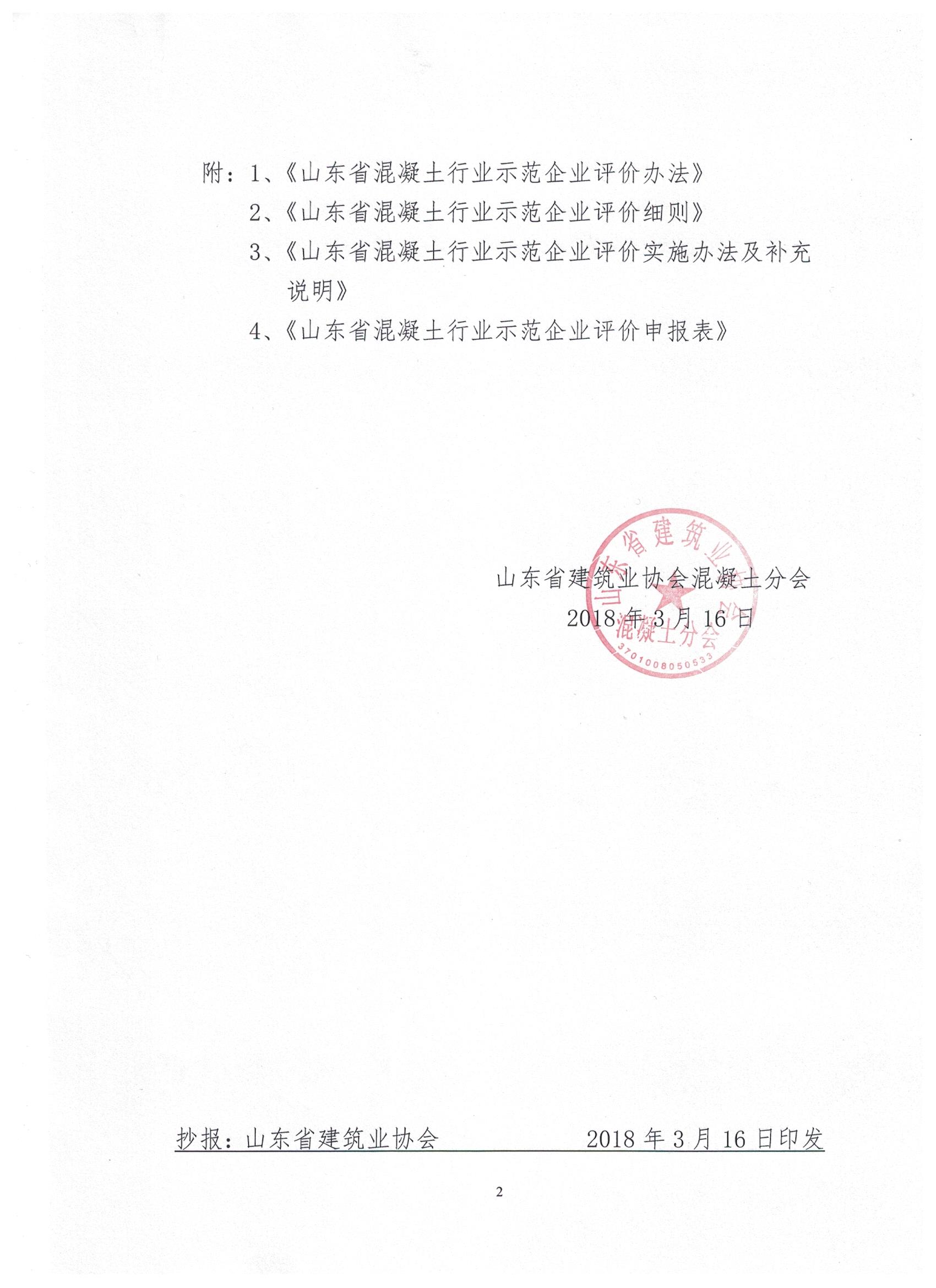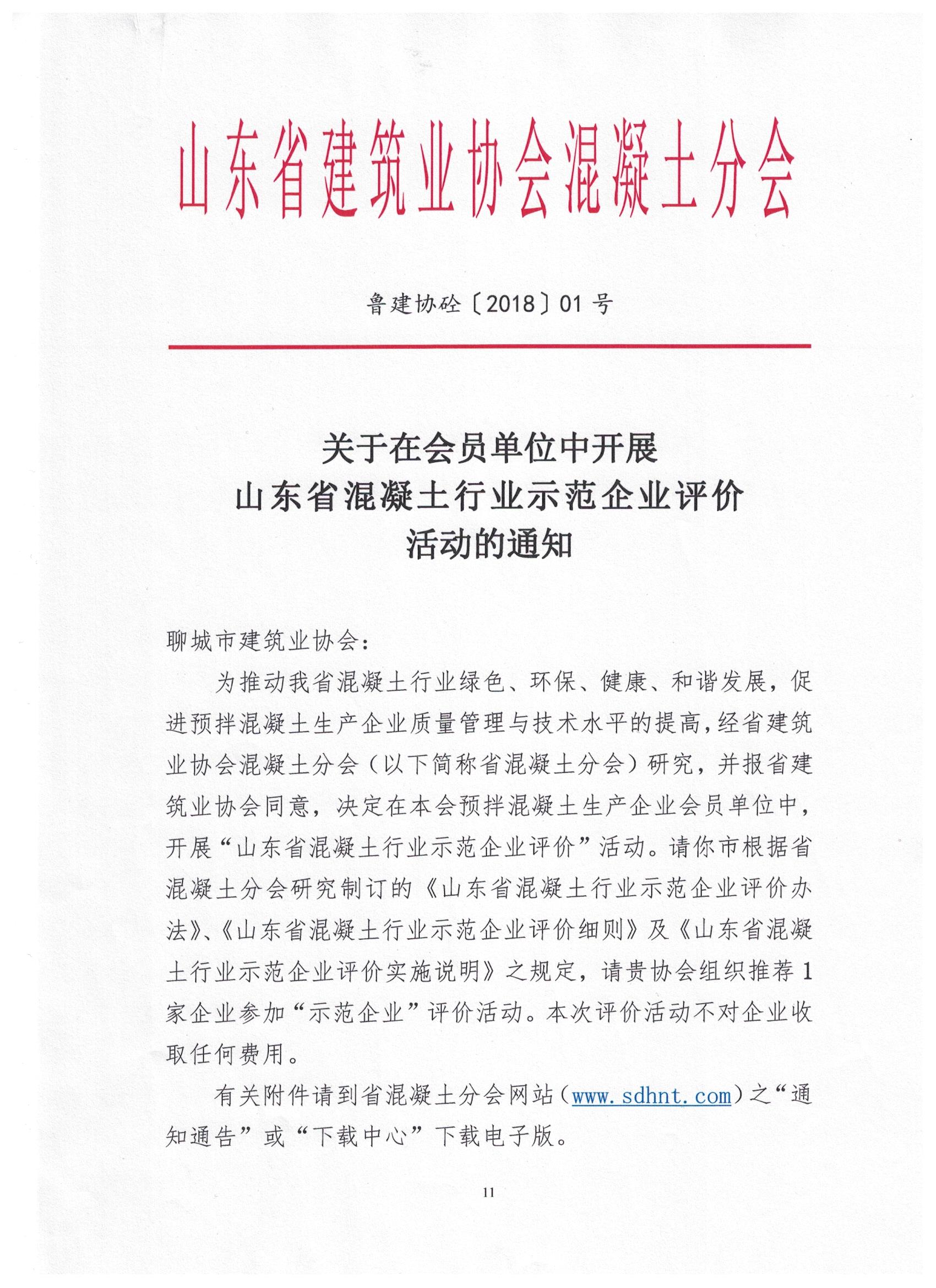 各会员单位: 山东省建筑业系会混凝土分会正在开展“山东省混凝土行业示范企业评价”活动,聊建协将推荐我市企业参加“示范企业”评选。这将对我市预拌混凝土生产企业质量管理和技术水平的提高起到极大的促进作用,且获得“示范企业”的单位,将具备推荐参评“中国混凝土行业优秀企业”的基本条件。现将具体参选条件和其他事项公布如下,望达到标准的企业积极申报,择优推荐。 一、我市建筑业协会会员; 二、企业须为省混凝土分会3A级以上的“信用企业”; 三、通过GB/T19001-2008(ISO9001-2008)质量体系认证,评价单位与认证单位名称一致,证书在有效期内。 四、申报企业必须对申报材料的真实、有效性负责。凡因提供虚假材料、证明或证书而骗取“示范企业”荣誉的,一经查实,省混凝土分会将对其通报批评,并取消参加下届评价资格。同时,由市建协负责将其“示范企业”证书、牌匾收回,取消其称号。