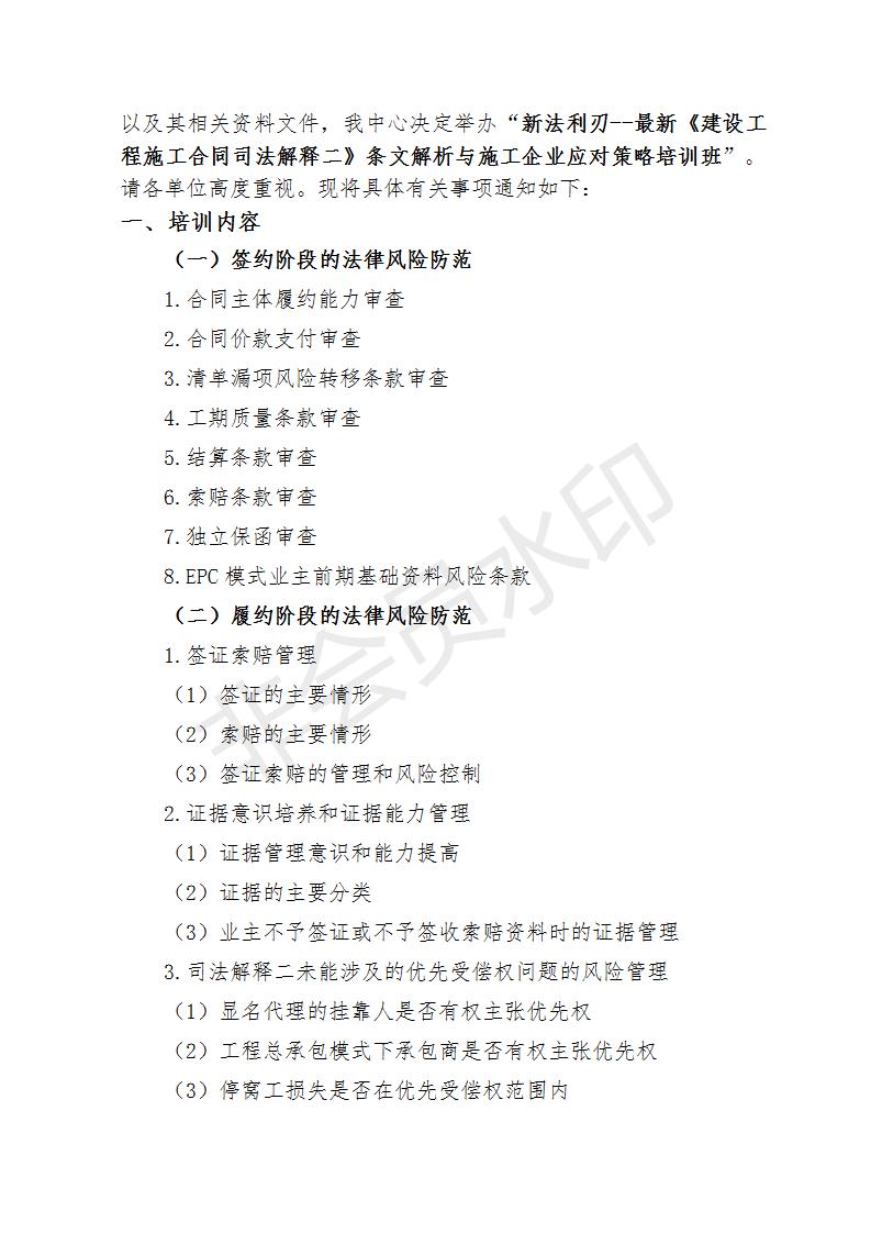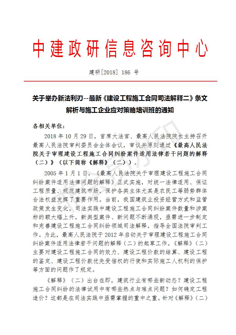 关于举办新法利刃--最新《建设工程施工合同司法解释二》条文解析与施工企业应对策略培训班的通知